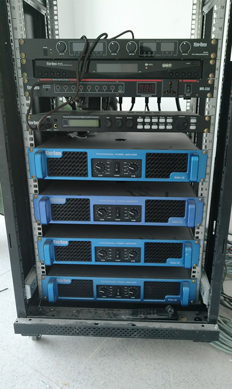 放大設備——指對經(jīng)過調控設備混音輸出、信號處理后的信號進行后級功率放大設備,這里指專業(yè)功率放大器;重放設備——指將經(jīng)過后級功率放大器放大的音頻信號進行電—聲轉換并釋放表現(xiàn)出來人耳可懂的聲頻信號的設備,這里指揚聲器;