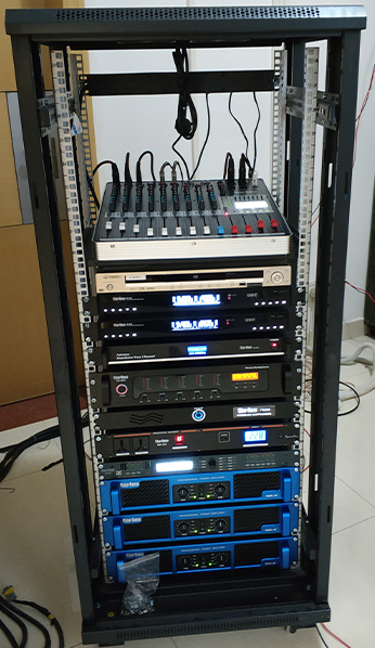 放大設(shè)備——指對經(jīng)過調(diào)控設(shè)備混音輸出、信號處理后的信號進(jìn)行后級功率放大設(shè)備,這里指專業(yè)功率放大器;重放設(shè)備——指將經(jīng)過后級功率放大器放大的音頻信號進(jìn)行電—聲轉(zhuǎn)換并釋放表現(xiàn)出來人耳可懂的聲頻信號的設(shè)備,這里指揚(yáng)聲器;