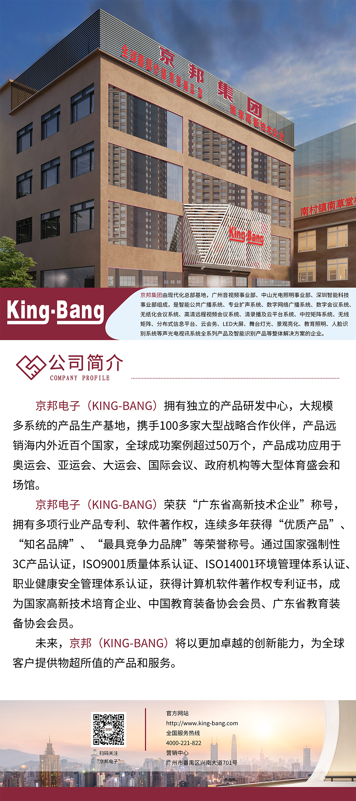 廣東京邦智慧科技集團(tuán)有限公司自成立以來(lái),一直專注于數(shù)字音視頻技術(shù)的研發(fā)和應(yīng)用,不斷提升自身技術(shù)水平和創(chuàng)新能力。經(jīng)過(guò)多年的努力,公司已經(jīng)發(fā)展成為國(guó)內(nèi)數(shù)字音視行業(yè)的領(lǐng)軍企業(yè),產(chǎn)品和服務(wù)覆蓋了會(huì)議、公共廣播、擴(kuò)音等多個(gè)領(lǐng)域。