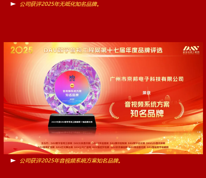 【喜報】京邦電子榮獲2025年度DAV數(shù)字音視工程網(wǎng)三大權威獎項,助力贏得市場矚目